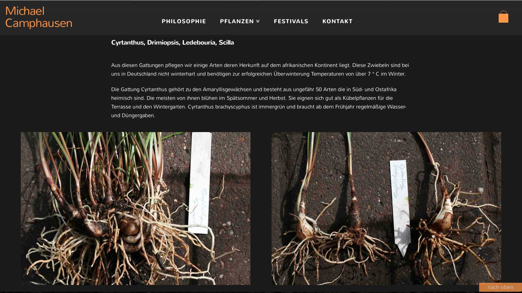 This project didn’t just present itself as a design issue. It turned out to be much more than that. It required getting to know the customers, people that are very different from customers that you would encounter when working in a clothing store or marketing for an orchestra. Instead of just selling things I had to make sure that the message wasn’t left behind. It is all about the story, about the feeling that is created. Michael loves what he does and this love can be felt in his writings and the photographs he takes of his plants. It is much more than a job to him, actually it is his destiny. Therefore, my job was to gather all that and bring it together into one website. With that came several smaller projects, marketing-relevant decisions were taken to adapt the processes at the nursery to what his customers and fans wanted to see, and all that developed into an ongoing project.
