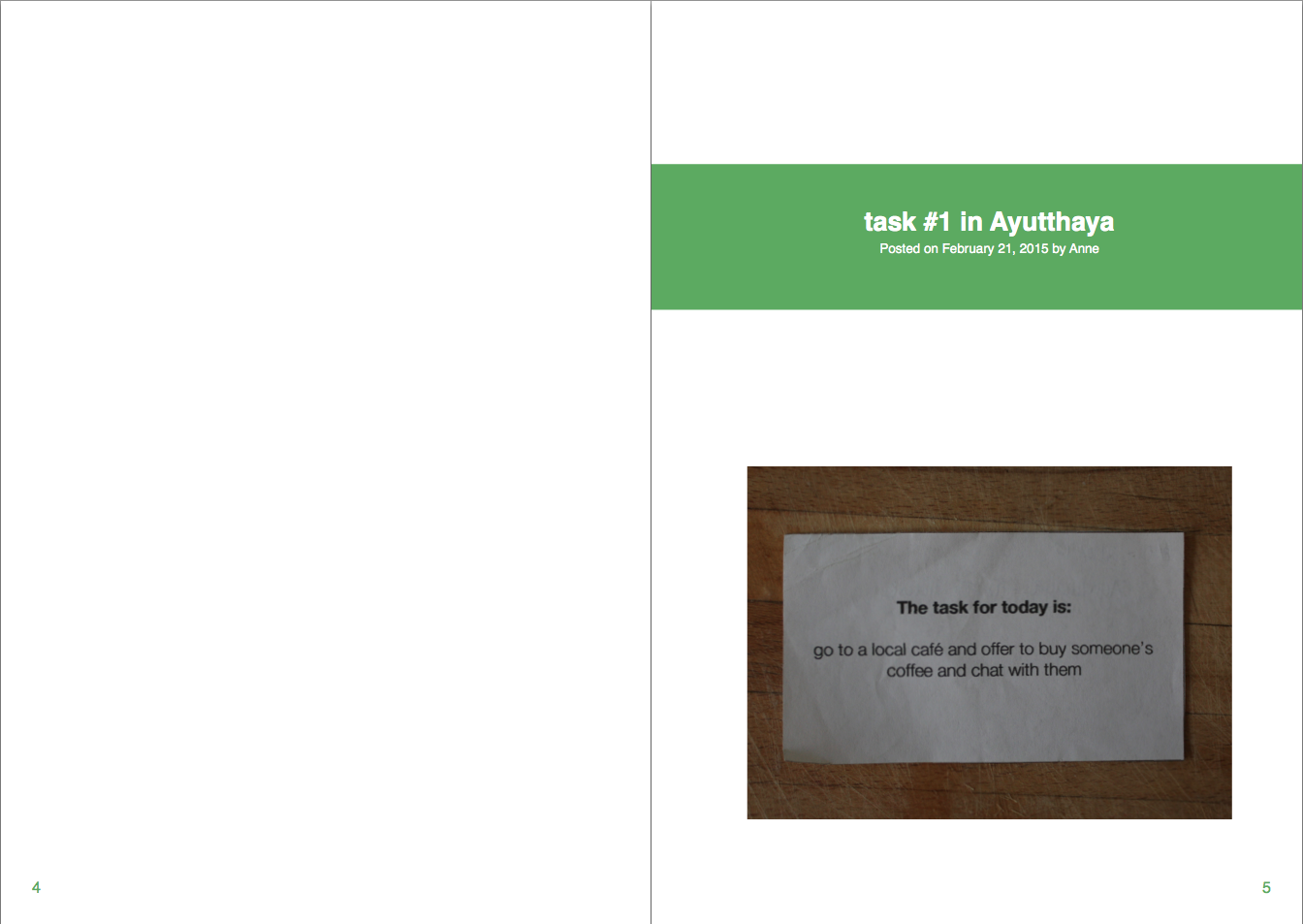 The traveler will receive one task per day, which was created by friends and/or even complete strangers. This task will only be revealed on the specific day of travel. The person then has the entire day to fulfill and document the task. There are three levels of documentation. The first level is real-time (via twitter) and serves to inform about the new task. The second level is the summary (via blog) and the final level will be published in the form of a book.